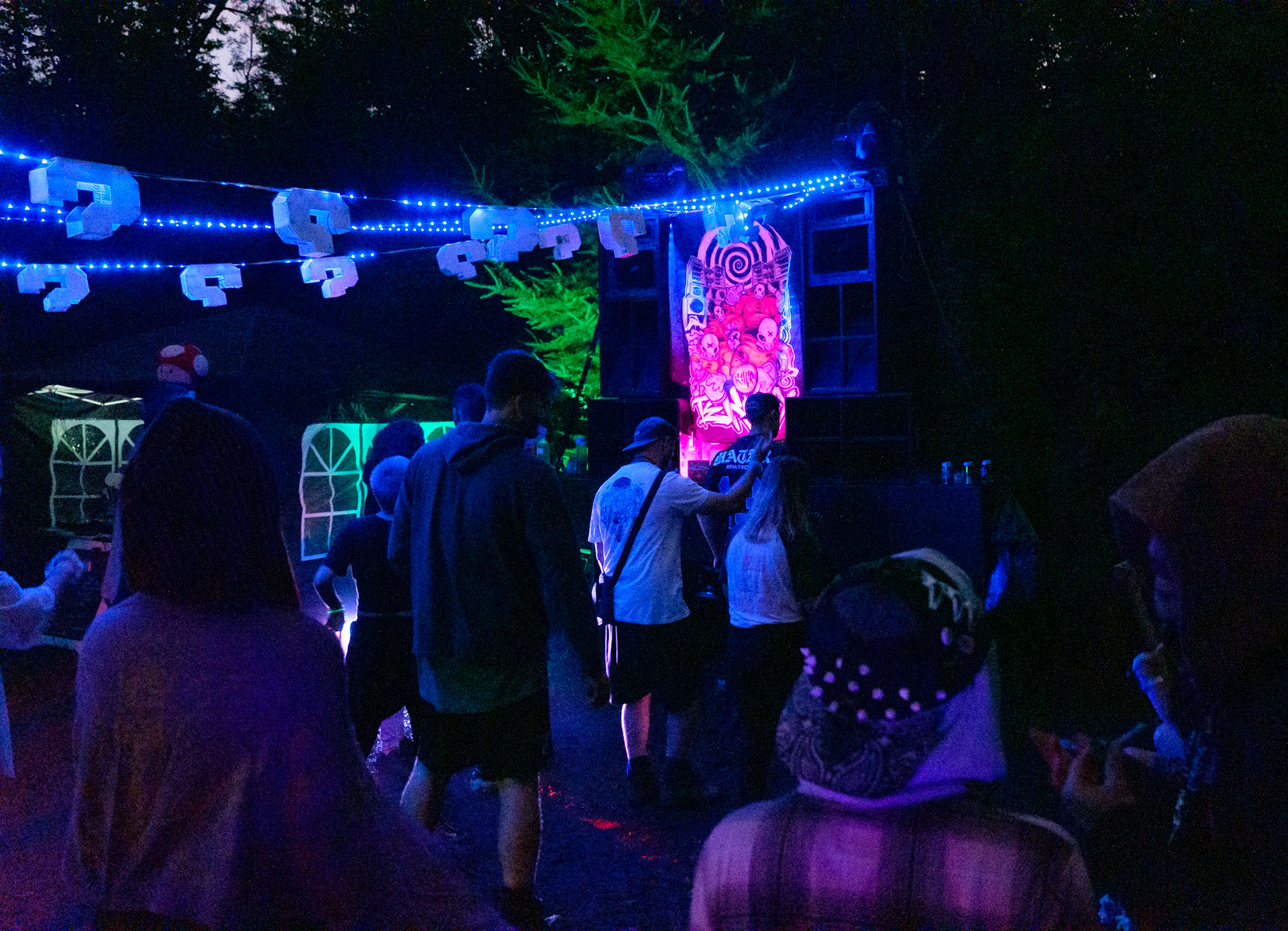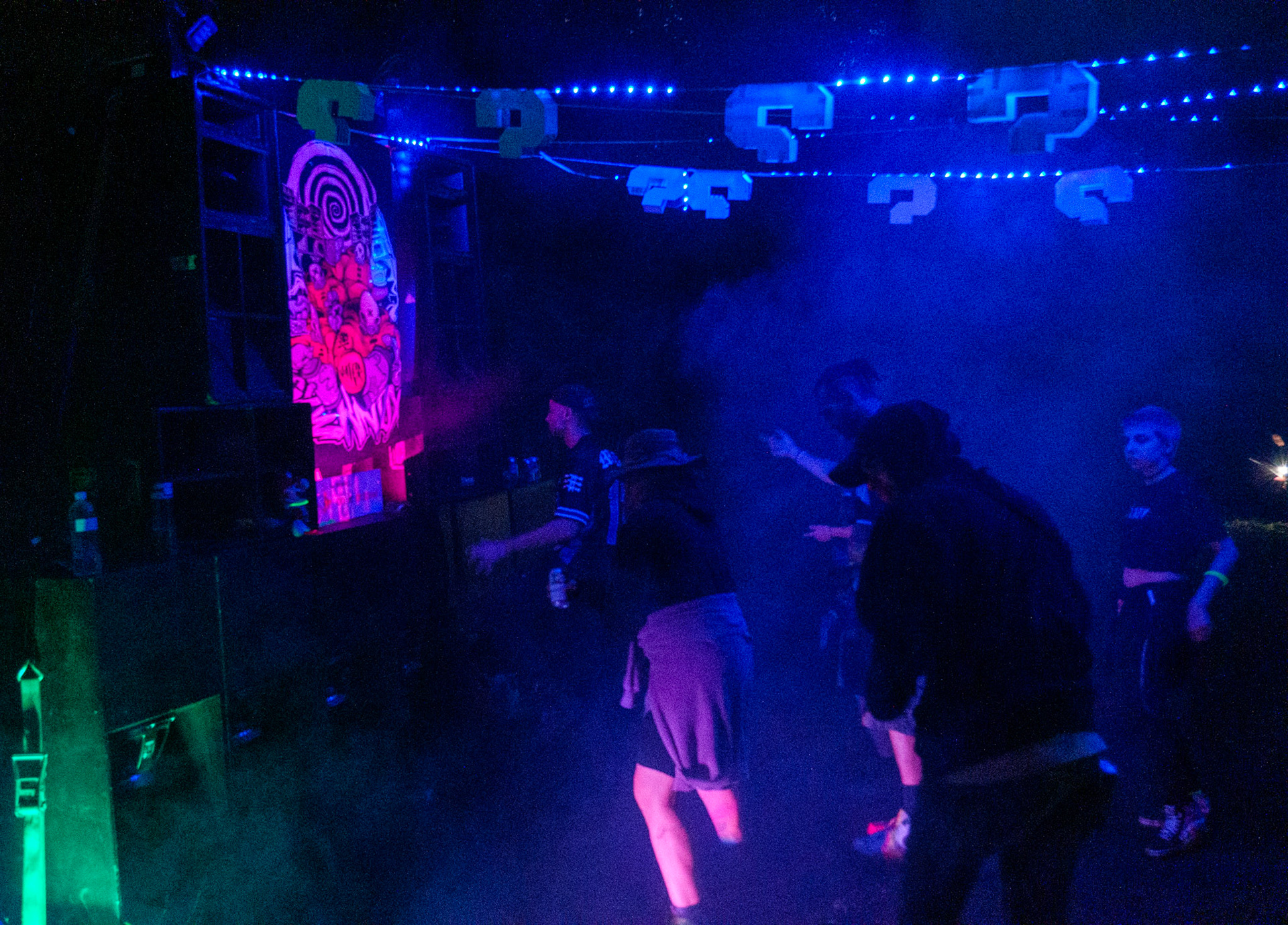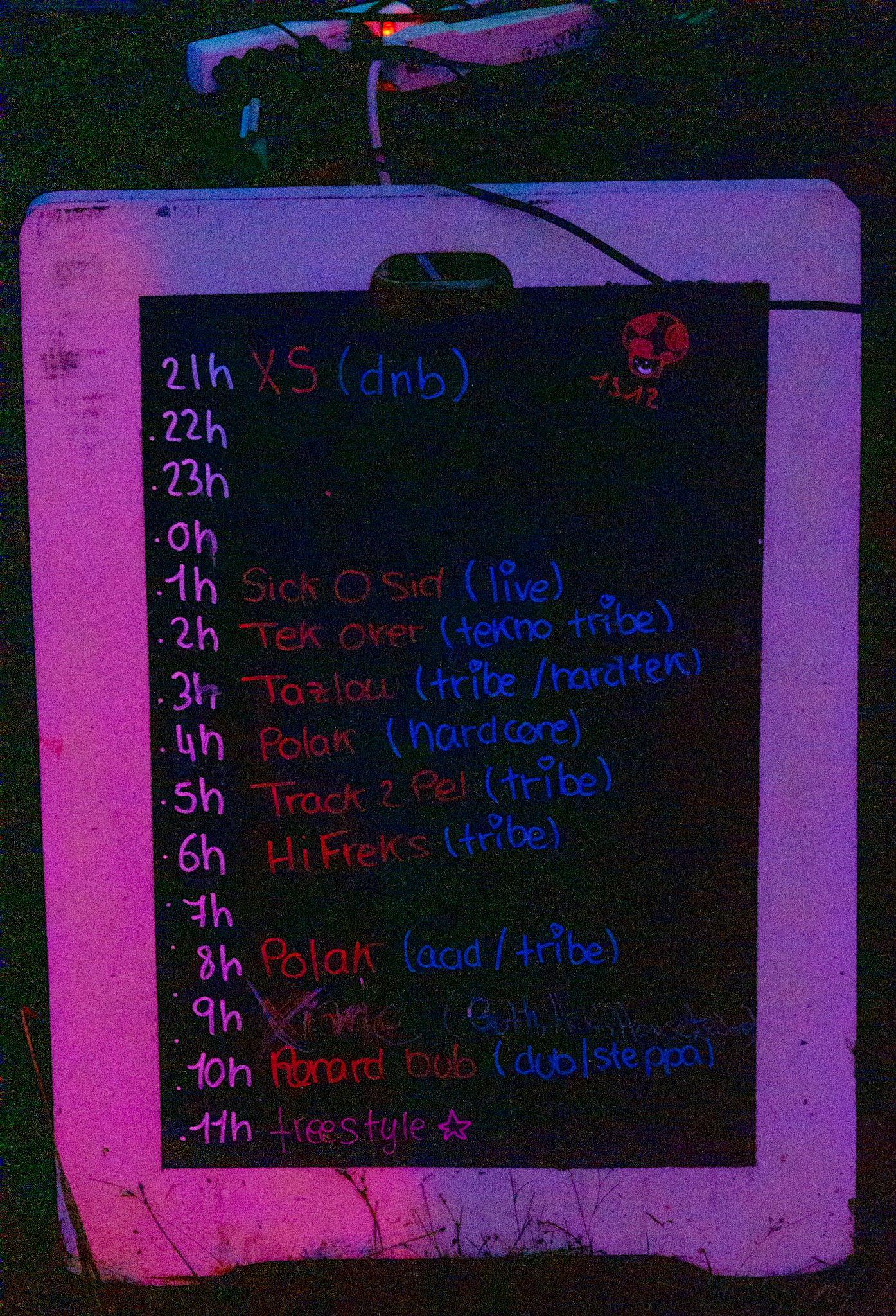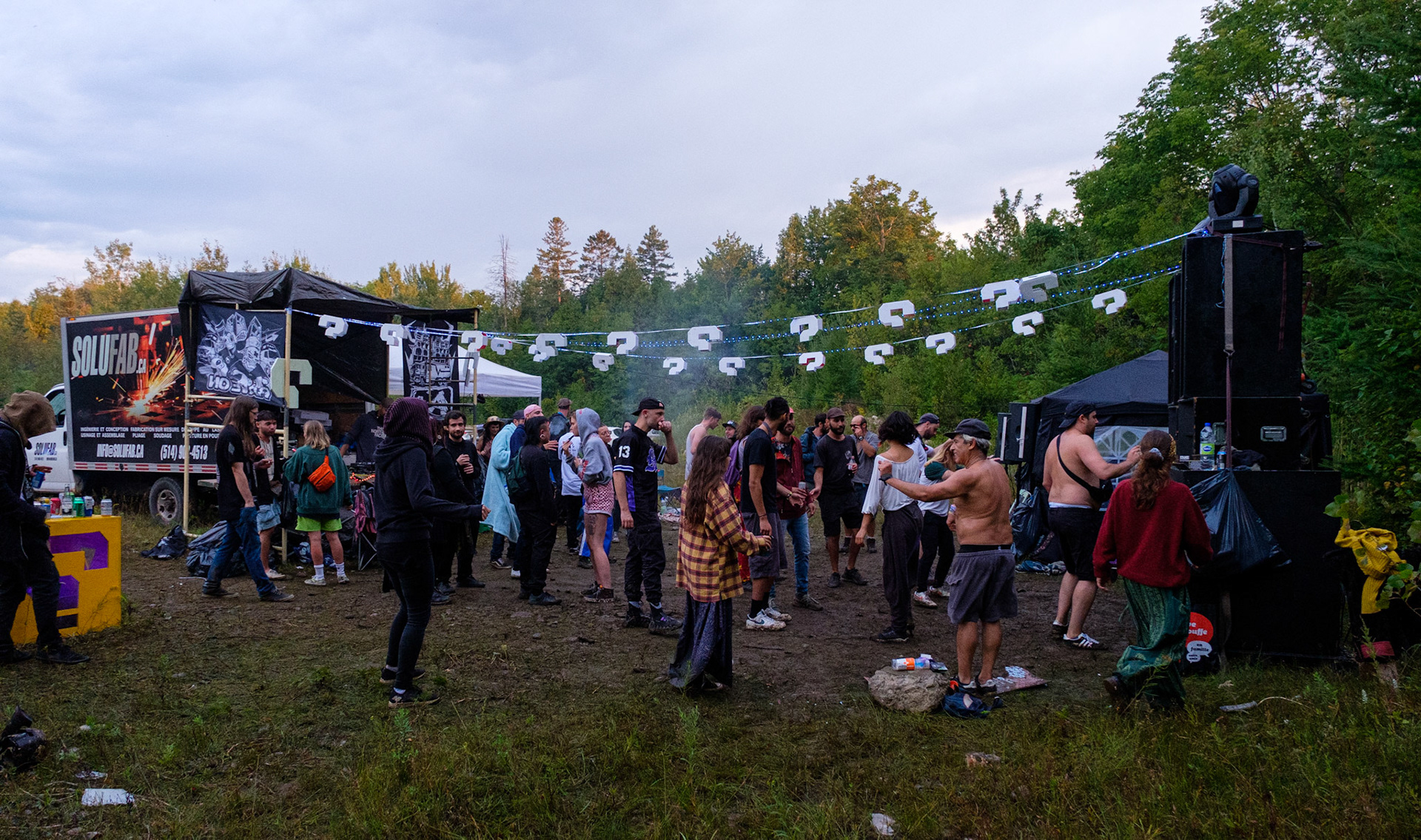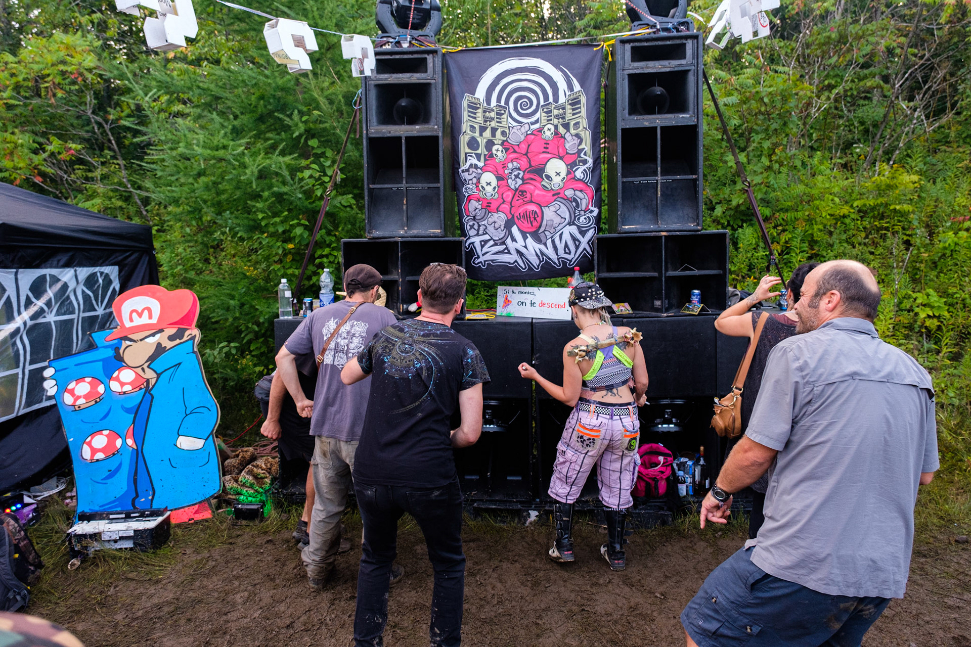 Free party par le sound system Khaos Techniks au Québec. Tournez à gauche après le chemin de l'Arc-en-Ciel pour une nuit sous le signe du sourire et de la tekno.